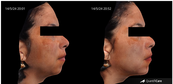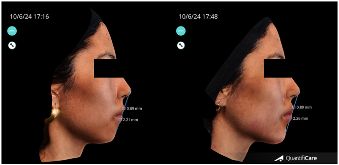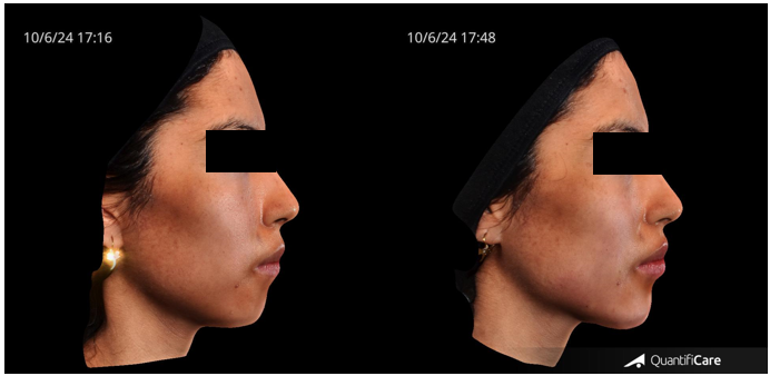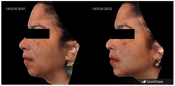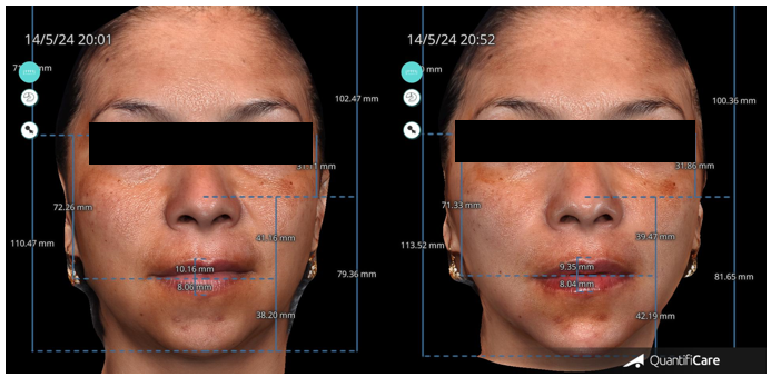 Figure 7 shows the transformative results of the 3-Point Injection Technique, as visualized using Quantificare and Lifeviz technology. The before-and-after comparison, viewed from the front, reveals a noticeable increase in facial length and a more defined, angular facial contour.