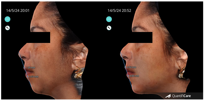 Figure 5 Before and after the 3 Point Injection Technique with the measurements from the nose, Lip and chin.