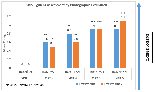 Both Rosa T cleanser and Rosa T serum (Test Product 2) and Placebo cleanser along with Rosa T serum (Test Product 1) shows significant reduction in skin pigment after 7, 14, 21 and 42 days from baseline as shown in Figure 3.
