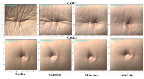 In the present study, after the treatment the participant of Case I showed an improvement of up to 50% morphological alterations of the skin, such as in relief, roughness and texture of the skin. In Case II, there was an improvement of about 20% in relation to the aspects of roughness, texture, depressions and elevation of the skin. Both benefits can be seen in the images and analysis of AnteraPro® software (Figure 1), after 6sessions, 10sessions and at the 3-month follow-up of the end of treatment (Figure 2).