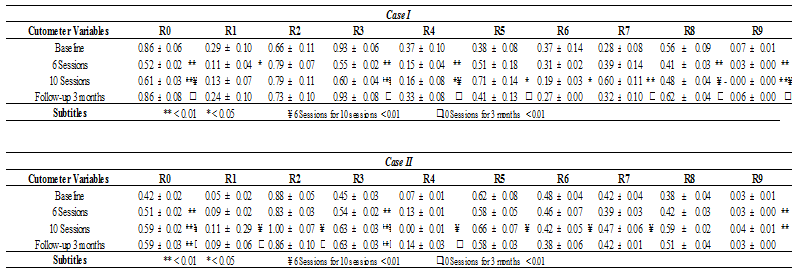 As observed in Table 1 of the Cutometer® evaluation, both cases presented significant results between p<0.01 and p<0.05 for the variables analyzed, however, each variable behaves in a coherent manner regarding the mechanical properties of the skin. Case I, represented in Table 1, shows an improvement in skin firmness, for variable R0 obtained a value of p<0.01 between baseline, 6 sessions and 10 sessions and follow up; The values of R managed to remain far from the value of 1.