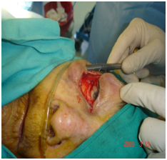 Basal cell carcinoma is the most frequently observed, and fortunately if the patient consults early, the cure is the rule; around 80% of all cutaneous malignancies are of this type.1 At the beginning of our formation as dermatologists we learned to treat basal cell carcinomas using curettage and electrodessication; then, in the decade of 80´s it was the turn of cryosurgery. At that moment we thought that we were in the right way. At the present time,1 however, our form of thinking is that among the multiple forms of treatment, our preferred, with no discussion, is the surgical one. Is the only one who allows us not only to remove the tumor, but to study in depth the margins around it? Even more: generally is possible to perform the tumor removal and its cosmetic repair at once, in only one session (Figures 1‒6).2‒5