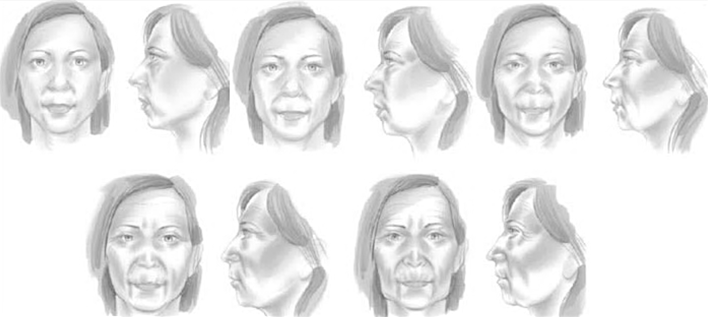 Fundamental features of facial aging result from the resorption of the bone skeleton from the sliding of the volumes due to increased skin laxity. Factors predisposing laxity are divided into intrinsic, such as connective tissue disorders and extrinsic such as exposure to ultraviolet rays and cigarette smoke.1