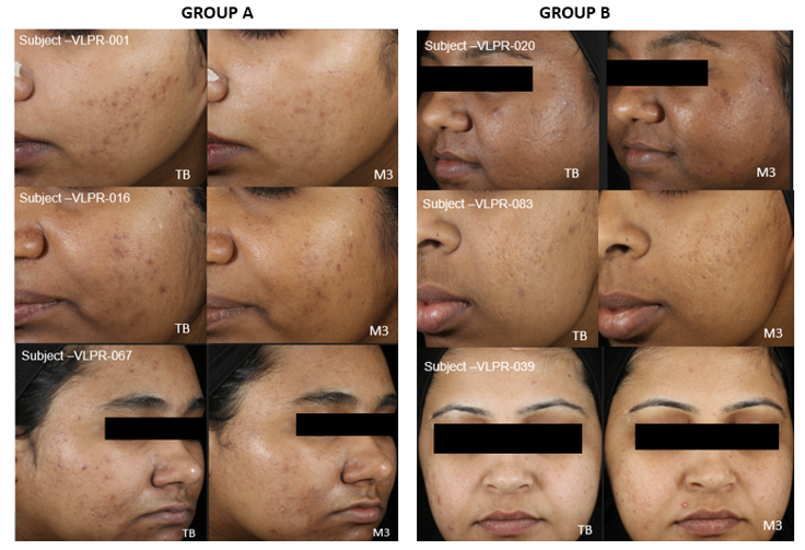 Materials and methods: One hundred and twelve females with mild to moderate PIH were enrolled and randomized to Group A (New Liftactiv B3 Melasyl) and Group B (Placebo) and subjects used either the test treatment or the placebo serum twice daily for 3 months. The main outcome measures were improvement in post acne hyperpigmentation index (PAHPI) and Investigator Global Assessment (IGA) scores, improvement in skin attributes, improvement in parameters using spectrophotometer, corneometer, tewameter, Antera, and VISIA CR. Evaluations were performed at baseline, months one, two, and three.
