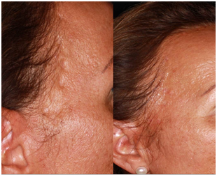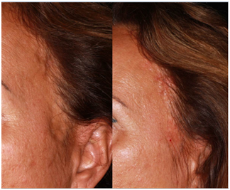 A 46years-old woman presented FFA consistent with a progressive alopecia localized to the frontal and temporal hairline as a band with atrophic and shiny skin. Follicular keratinization and perifollicular erythema were present. We prescribed treatment with oral dutasteride 0,5mg daily combined with 5% minoxidil lotion. We infiltrated intralesional corticosteroids along the line of frontal hair implantation. Injections were performed with triamcinolone acetonide 0,1ml diluted in 0,4 lidocaine 1%. We administered 0,03ml per point following a headband distribution. The patient attends a week later for the appearance of depressions located in sites of corticosteroid injections. We refilled the cutaneous atrophy by infiltrating hyaluronic acid (Belotero Soft®) with subcutaneous micro depot technic, obtaining excellent results in only one session (Figures 1) (Figures 2).