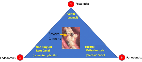 Figure 1 The three pillars of dentistry: 1- Restorative; 2-Endodontics; 3- Periodontics. The successful diagnosis and treatment of the triad of hard tissues can be seen. The yellow arrow identifies an area of hypoplasia which the authors refer to as axial or horizontal periodontics to stress that orthodontic treatment should follow in line with Restorative and Endodontics procedures, towards the restoration of alveolar bone or the third hard tissue as part of Periodontics.