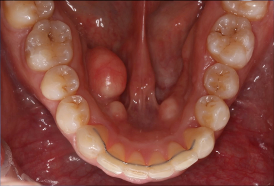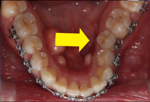 Figure 4B Brackets are placed on lingually inclined mandibular teeth to facilitate alveolar bone restoration which in turns promotes the creation healthy soft tissue and the elimination of the hypoplasia (Orthodontosis). Note that brackets are not placed on labially positioned mandibular teeth.