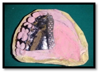 After impression was made, an altered cast was fabricated (in dental stone) that contain both dentulous part and impression of defect (Figure 7). Make two duplicate casts from the final casts for processing of the Obturator in heat polymerizing acrylic resin (DPI Heat cure; Dental Products of India, Mumbai, India). Use one duplicated cast to fabricate defect (or bulb component) and another duplicated cast for fabrication of normal palatal component. Note that the defect of the cast to be used for palatal base-plate should be filled with stone for block out the defect before processing.