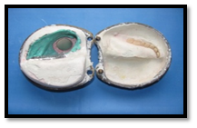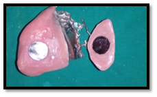 To reduce the weight of intra oral obturator defect part was followed by packing, a pouch of salt was used (lost salt technique). Curing procedures were performed according to the manufacturer’s instructions. The cured internal portion (bulb) was retrieved after deflasking, and the salt was removed after drilling 2 mm holes in the lid portion5,6 (Figure 8A–8F). Process, finish, and polish both the components of obturator. Try both components on the final cast. Perform try in of each part individually and then simultaneously to verify their adaptation to oral tissues. Select a pair of suitable magnets for joining two components of the obturator. Create space to accommodate one piece of magnet in each component. Mix auto polymerizing resin and attach magnet in bulb and plate component simultaneously, and prevent the resin to flow on extra surfaces that interfere with attachment of both components (Figure 6B).
