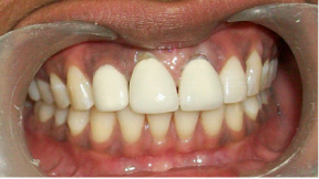 After two days temporary crowns were removed then all-ceramic coping trial was done and after one week temporary crowns were removed and internal fit of the all-ceramic restoration was evaluated intra-orally with a disclosing agent (Fit checker, GC America) and occlusion was assessed in inter cuspal & excursion position. Minor adjustment was made and again crowns sent for glazing. The crowns were cemented with self etch unicem luting cement (3MEspe). Patient was satisfied with the crown length, width and esthetics which was improved and equal to adjacent natural teeth (Figure 4a and 4b).