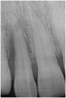 Figure 3 Periapical radiograph of tooth #7 taken 6 months after surgery demonstrated bone fill in the treated area with a uniform trabecular bone pattern.
