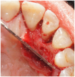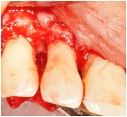 Figure 8 Facial view of tooth #26. Reflection of a full-thickness flap showing the bony defect on the distal-facial aspect.