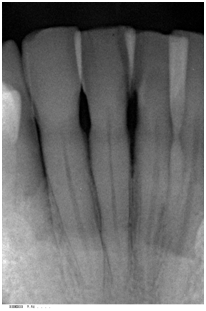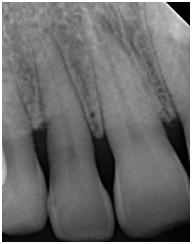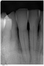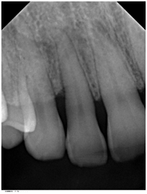 A 42- year-old white female with a non-contributory medical history was referred in May 2014 for a periodontal examination and treatment and specifically for a localized increasing pocket depth on maxillary right lateral incisor which had an initial PD of 9 mm on the disto-palatal aspect and Miller Class I mobility with BOP (Table 1). Bone loss, as determined by the radiograph (Figure 1) was an angular defect. The patient’s oral hygiene and plaque control were very good.