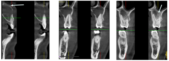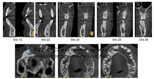 A cone beam CT scan (CBCT) confirmed a well-defined hypodense lesion in the maxillary region. The vestibular cortical bone was displaced and ruptured in several areas, with evidence of compromised integrity of the nasal and sinus floor (Figure 2).