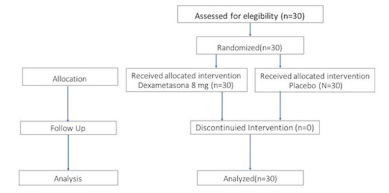 A total of 30 patients were included in the present clinical trial, consisting of 25 females (83%) and 5 males (17%), with average age of 20±2 years old. Thirty patients were divided into two groups, as shown in the CONSORT flowchart in Figure 1.