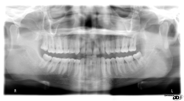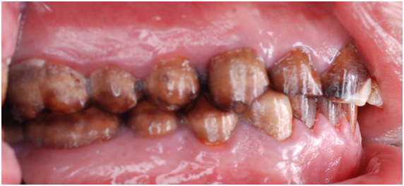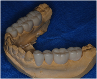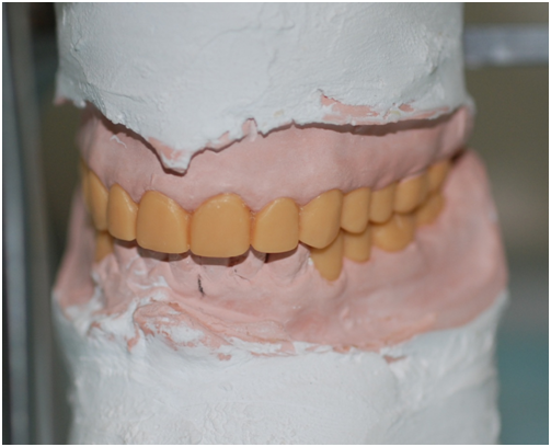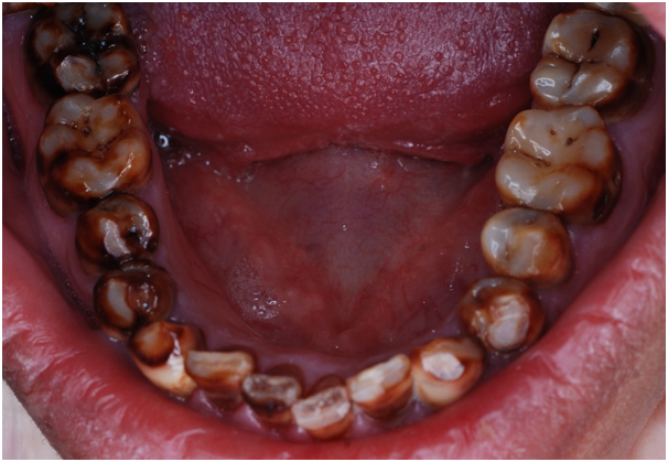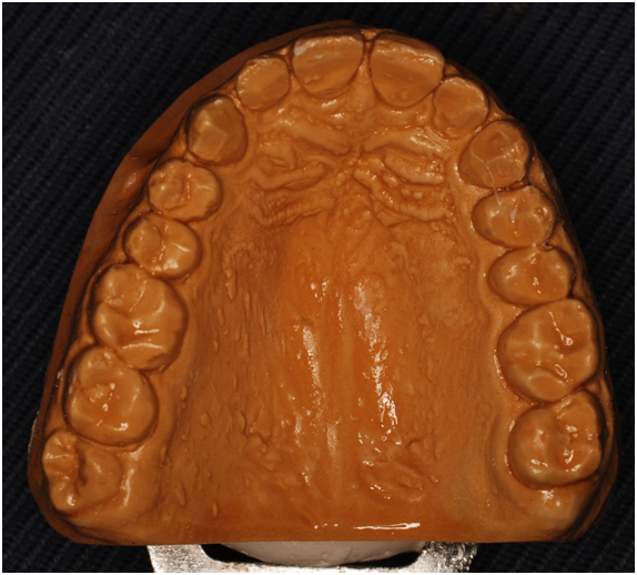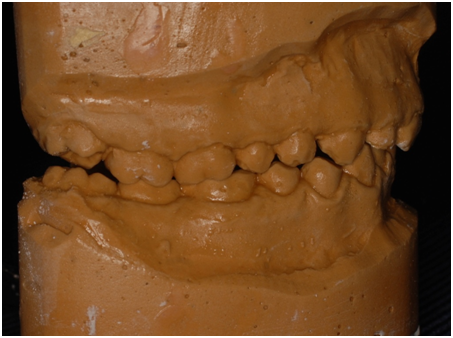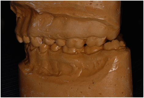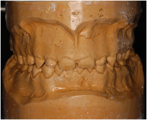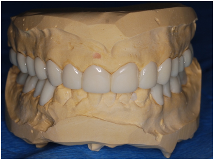 A 22 Yemeni male patient presented to the College of Dentistry clinics at the University of Dammam seeking cosmetic treatment with a chief complaint “I want to improve the way my teeth look " He reported no significant medical history. Patient has never been into the dental clinic. He stated his deciduas teeth were normal and his whole village complains of darkened teeth (brownish). A panoramic x-ray (Figure 1), intraoral pictures (Figures 2−6) as well as study casts were taken to diagnose the case (Figure 7). Upon examination, the patient was found to suffer from severely generalized discoloration of permanent teeth and moderate dental attrition resulting in shortening of the vertical dimension of occlusion (VDO). A class I occlusion with class I canine relation was present, with an over-bite of 4mm and an overjet of 4mm. The upper lip seems stretched with dropping mouth angles. The patient suffers from generalized marginal chronic gingivitis with no mobility or furcation involvement noticed. The treatment plan started with plaque control measures were conducted as well as patient education. The patient's esthetic problem caused by Fluorosis both teeth staining and facial appearance and occlusion. The treatment options available range from bleaching, porcelain veneers, full coverage ceramic crowns or porcelain fused to metal crowns. Due to the Fluorosis severity, the bond strength of the adhesive agent was questionable that eliminated the veneers option. Bleaching when tried had minimal effects. Finally, porcelain-fused to metal (PFM) crowns were selected to restore esthetics of anterior teeth, while posterior gold crowns were chosen to raise the occlusion posterior by 2mm. Treatment options were discussed with the patient who consents to the treatment plan.