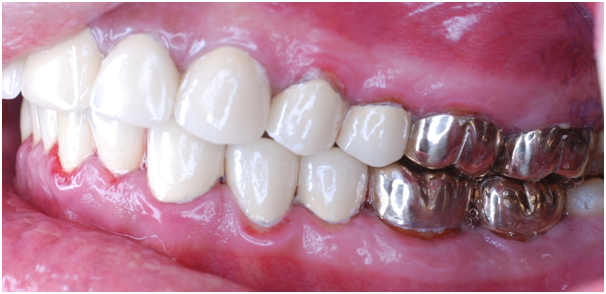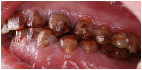 Treatment modalities if needed to restore esthetic of fluorosed teeth varies according to patients need, other existing conditions an important selecting factor rely on conservatism as well as longevity and patient satisfaction. For this case, a full mouth rehabilitation was found to me most suitable, done through raising the vertical dimension using full coverage gold crowns for posterior teeth and porcelain fused to metal crowns for anterior teeth such restoring form, esthetic and function.