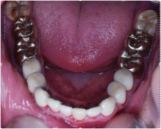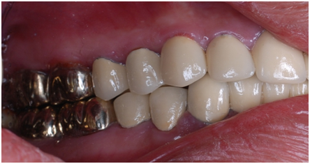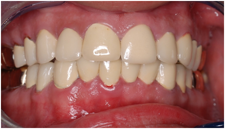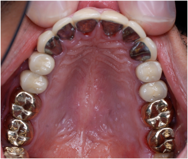 Esthetic, phonetics and occlusion were checked after cementation the temporary crowns with temporary (Pro. Temp) luting agent. To avoid any functional problems, the patient was instructed to give the temporaries a period of trial for 2 weeks. Intra occlusal relationship was repeated at this stage again. When the patient reported no discomfort, the final crowns were constructed. Final crowns were cemented using resin composite (Rely X Unicem) luting agent. Teeth restored were # 2, 3, 4, 5, 6, 7, 8, 9,10, 11, 12, 13, 14, 15,18, 19, 20, 21, 22, 23, 24, 25, 26, 27, 28, 29, 30 and 31. Postoperative pictures, x-rays, and impressions were taken (Figure 9−19). The case had a good prognosis considering the patient, good general health and proper attitude toward his oral hinging reported during the maintenance and treatment phases. The periodontium is in functional health status, using gold alloys to restore posterior teeth as well as porcelain-fused to metal crowns to restore anterior teeth conserve tooth structures by minimizing the amount of tooth structure to be cut.