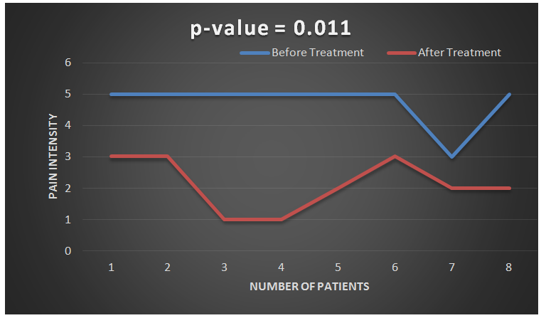 Total 10 patients were recruited for this study. Two of them refused to get treated by this technique; rest 8 patient’s data were included in the main analysis. Out of which 7 patients were female and only one was male with the age mean range between 50 to 59 years. Ninety percent were non-Saudi. Patient was asked if they have any past knowledge or previous exposure of this kind of technique or treatment, all of them do not have any idea about this kind of treatment. More than 60% patients believed that pain will be reduced after getting acupressure and there will be no need for dental injection as shown in Table 1. No patients used analgesics before arriving for treatment. There was insignificant relation found between those who believed that pain will reduce after acupressure and patients who felt relief in pain. Mean pain intensity (physically noted) before treatment was 4.75 (range 3 to 5) and after treatment it was 2.13 (range 1 to 3) according to the analogue scale of pain. There was significant reduction noted in pain after getting treated with acupressure technique (p=0.011) Figure 1.