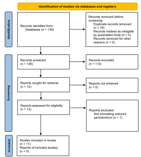 Study selection was performed independently by two reviewers, using pre‑defined inclusion and exclusion criteria (Table 2), in two stages: (1) screening of titles and abstracts, and (2) full‑text evaluation. At the title‑screening stage, 12 studies were initially selected as clinical studies conducting FEA and directly related to orthodontic treatment and periodontal condition in patients with reduced periodontium or a history of periodontitis. During full‑text review, one study was excluded for not satisfying the criteria. Finally, 11 studies that fully met the PCC criteria were included for analysis in the review (n=11).
