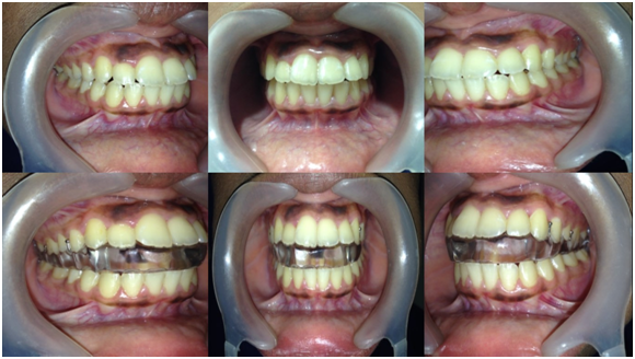 Hegab TMJ Splint (HTS) is Maxillary full-arch hard stabilization splints fabricated with fluid resin. The splint attached to the upper jaw using ball clasps without any extensions of the acrylic resin on the buccal or labial surface of the upper jaw. The retention of the splint to the upper jaw is coming only from the ball clasps. The occlusal splint has indentations on its occlusal surface to guide and hold the mandible in centric relation (Figure 1). The occlusal splint vertical thickness of 4 mm used for treatment of the cases with disk displacement with reduction (DDR-HTS4). While for cases of disk displacement without reduction, 6 mm vertical thickness of the occlusal splint was selected (DDNR-HTS6). The vertical thickness of the occlusal splint was measured at the molar area and the indentations help to achieve the Simultaneous equal contacts on all teeth (Figure 2). The selection of the vertical thickness of the occlusal splint based on evidence based study using the MRI to evaluate the movement changes within the TMJ with different splint thickness.4