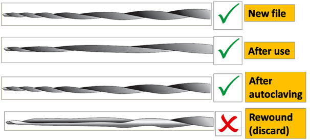 Root canal treatment should result in the thorough mechanical and chemical debridement of the entire pulp cavity, followed by a three dimensional obturation. Larger NiTi instruments may transport the canal space, causing strip perforations because of their rigidity. This issue has been easily resolved by the introduction of Controlled Memory files (Hyflex CM, Coltene), which retain their shape in curved canals and do not possess the ‘Spring back action’, thereby avoiding any perforation. The conventional NiTi files have another drawback of not giving a ‘warning sign’ before breakage (unlike stainless steel files, which show such signs in the form of unwinding of flutes, or presence of a shiny spot on the file, indicating that the file should be discarded). Hyflex files have overcome this problem with the unique characteristic of rewinding of the file (Figure 6) after autoclaving.9 If the file does not rewind, it indicates that it needs to be discarded. This is a very useful criteria for the clinician to decide when to discard the file. A unique combination of 3 and 4 fluted file designs has been incorporated in these files to provide optimum performance and strength. Also, these files can be pre-bent similar to stainless steel files before introduction in the curved canals. In general, there are a few technical considerations to be kept into account while using Hyflex files. The number of times the instruments can be re-used depends on the treatment and procedure. Instruments must be inspected before and after use. Hyflex® CM files may respond to pressure, torque, and resistance with a lengthening/opening up of the spirals. During autoclaving, the instruments can regain their shape, if it doesn’t, the file should be discarded (Figure 6). Electrical discharge machining (EDM), sometimes also known as spark machining, spark eroding, burning, die sinking, wire burning or wire erosion, is a manufacturing process whereby a desired shape is obtained using electrical discharges (sparks). Principle of Electrical Discharge Machining (EDM) technique is a controlled metal-removal process that is used to remove metal by means of electric spark erosion. In this process an electric spark is used as the cutting tool to erode the work piece to produce the finished part to the desired shape. The metal-removal process is performed by applying a pulsating (On/Off) electrical charge of high-frequency current through the electrode to the work piece. This erodes very tiny pieces of metal from the work piece at a controlled rate. The repeated bombarding of the alloy with sparks melts the material or even leads to evaporation in some places. The result is a file with a distinctly textured surface where heat creates a new surface hardness. Spark erosion generates a unique, hardened surface, which improves cutting performance even further.10 Hyflex EDM files are one of the first endodontic instruments manufactured with EDM technology. There are three different cross section designs in single file. The rectangular cross section at the tip provides more ‘core material’, which results in high resistance to breakage of these files. Then the cross section becomes trapezoidal in the middle of the file and finally near the handle, the cross section changes to triangle which keeps the file more flexible there. It can be labeled as a unique combination of flexibility and strength.