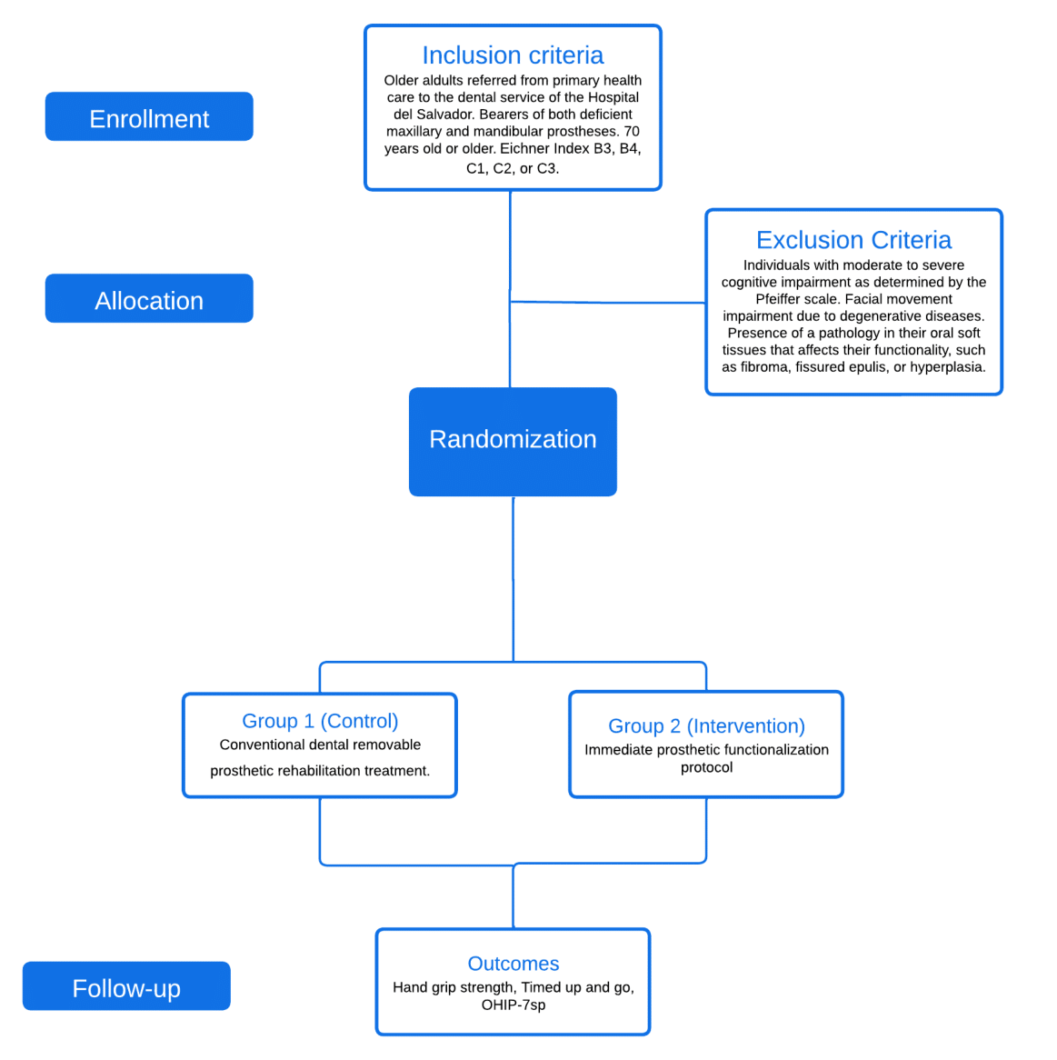 However, there are some limitations to consider. The study is conducted in a specific context, the Chilean public health system, which may limit the generalizability of the findings to other settings. Efforts have been made to minimize potential biases through randomization and blinding, but it is challenging to completely eliminate bias in clinical trials. Blinding the patients to their group assignment (control or intervention) is not possible. Due to the recruitment system, we cannot control whether the groups and subgroups to be compared are similar in the number of individuals composing them, which may limit the validity of comparisons, especially for significant variables such as the type of edentulousness (assessed according to the Eichner Index), which will be randomly distributed.