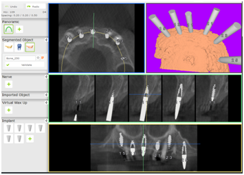 After segmentation of the teeth and cleaning of the bone, an implant plan is proposed according to the practitioner's indications and sent for correction or validation. (Figure 2) Implant planning after bone cleaning and virtual extraction of the remaining teeth.