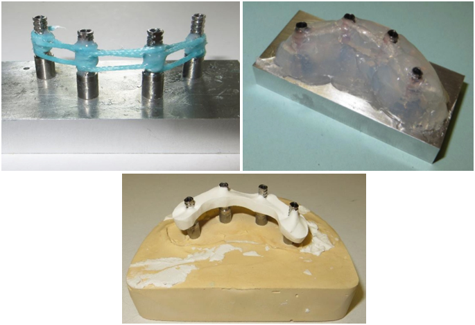 From the aesthetic assembly, the prosthetic implant is made according to the Fiber Force® CST technique. A very high resistance implant supported fiber-reinforced resin bridge is then produced, affording a perfect passive fit in terms of its mechanical effect on the implants and their accessories (adaptation without tension) and its interference with the play of the mandibular or maxillary bone parts. The impression technique makes the plaster validation key test unnecessary. However, the test was carried out in this case for demonstration purposes. Our experiment revealed that the plaster key screwed onto the implants never breaks (Figure 29-31).