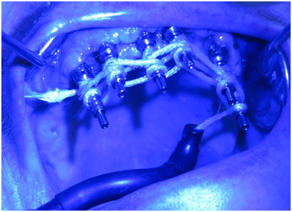 A braid of CST Link® is held in place with clamp forceps, placed behind the most distal implant post and wrapped around it once. The braid is quickly secured locally by rapid photo-polymerization under blue light (Figure 16). The CST Link® braid is then continued and looped counter-clockwise aroundeach post, towards the left most distal post. It is held tight using the D Lab tool (Figure 17).