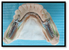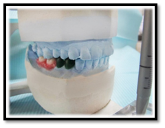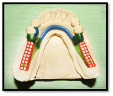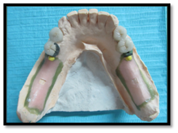 For every patient the following steps were performed: Diagnostic panoramic and periapical radiographs for both the first and second premolars at both sides. Periodontal therapy in terms of thorough oral scaling, pocket eradication and hygiene procedures. An accurate reproduction of the maxillary and mandibular arches was performed using irreversible hydrocolloid impression material** (**Cavex CA37, Holland BV, Haalem, The Netherlands) in a modified stock tray to obtain diagnostic casts. Diagnostic maxillary casts were mounted on Whip Mix articulator* (*Whip Mix Articulator 8500 Series, Louisville, KY 40217-0183, USA) using ear-piece face-bow transfer** (**Whip Mix Quickmount Face-Bow, Louisville, KY 40217-0183, USA) while diagnostic mandibular casts were mounted using centric relation. A great deal of information was gathered from articulated diagnostic casts that enabled us to achieve the proposed treatment plan. Diagnostic waxing up (Figure 3) and occlusal analysis were performed then the suitable related adjustments were done intra-orally to have harmonious occlusal balance. Each mandibular diagnostic cast was surveyed to assess the needed intraoral modifications to prepare the abutment teeth at both sides. Distal extension saddle denture was designed as follows: bilateral distal extension bases with two different designs of extracoronal semi-precision attachments (one at each side) using two premolar abutment teeth at each side with lingual bar major connector.