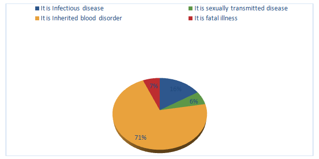 The majority of students (71.4%) were aware about sickle cell disease is inherited blood disorder (Figure 1). Approximately two third (64.1%) reported that Sickle Cell Disease diagnosis Via a blood test (Figure 2).