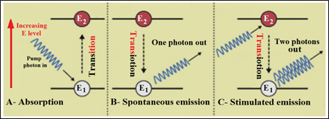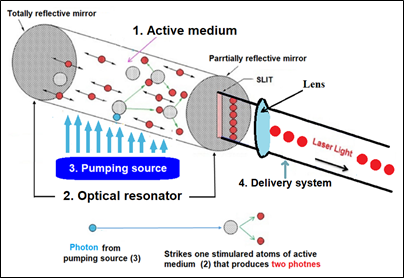 The three separate phenomena that occur during the production of an atomic spectral line outlined by Albert Einstein in 1916 (Figure 1 and 2)8 are spontaneous emission, stimulated emission, and absorption. Amplification of stimulated emission generates laser light.9,10 Amplification is a step in the laser's internal process. Understanding how light is produced can be aided by identifying the components of a laser instrument.9-11 A typical laser is made up of six fundamental components (Figure 2):