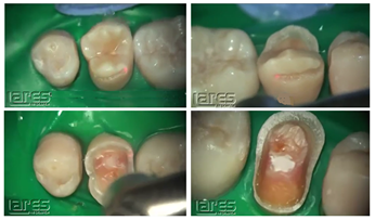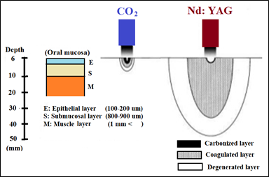 The initial phase hyperthermia occurs when tissue is exposed to temperatures above normal, but the tissue is not damaged. A temperature of 60°C causes denaturation and coagulation of the protein. Using the laser parameters within the temperature range, the clinical practitioner can eliminate the granulomatous lesion without vaporizing the surrounding tissue. At 70°C to 80°C, the tissue layers adhere to each other. The water within the tissue vaporizes as the temperature reaches 100°C. At this temperature, the ablation begins, but the dental tooth structures are not ablated. Dehydration is complete at around 200°C, and the tissue carbonizes (Figure 10). Continuous laser treatment causes tissue carbonization, which hinders normal tissue ablation, resulting in tissue necrosis.23,10