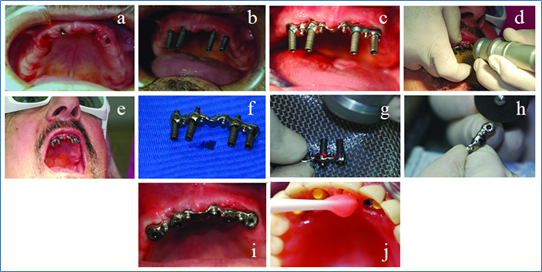 Figure 15 a) Patient just after four implants insertion, b) Abutment screwed to the implants, c) Bar inserted in the abutments, d) Intra oral laser welding, e) The bar welded to abutments, f) Bar and abutments removed from the mouth, g) The welding procedure completed extra orally by the same device, h) The abutment cut by disc, i) The bar reapplied into the mouth, and j) The OT Caps fixed with acrylic resin to the prosthesis58