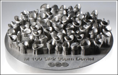 For the fabrication of CoCr crowns and bridges, laser sintering has now become the industry standard.63 It is now possible to create fully stress-free and properly fitted non-precious metal frames even for bigger bridge spans by optimizing post-processing after the actual building process. Because of the high number of units that can be placed on a single platform, the manufacturing time per unit has been lowered to just a few minutes (Figure 16). When it comes to fixed restorations composed of non-precious alloys, the process is incredibly cost-effective and well-established.
