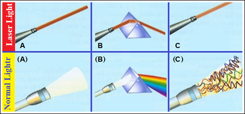 The common characteristics properties of all laser beam types (Figure 3As-C) in comparison to those of normal light (Figure 3A-C) are:-