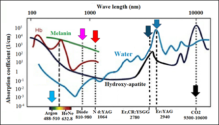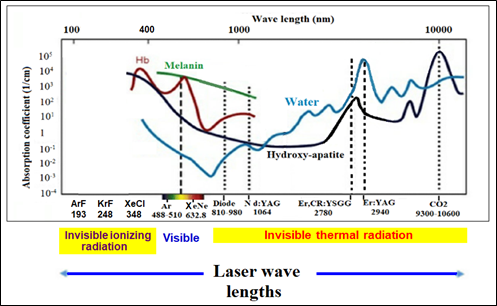 Figure 8 Different laser wavelengths in the electromagnetic spectrum and the relative absorption in dental chromophores. All the wavelengths of the dental lasers are in the visible and the non-ionizing infrared part of the spectrum.22