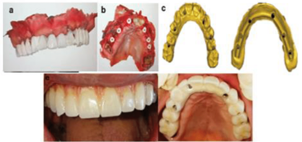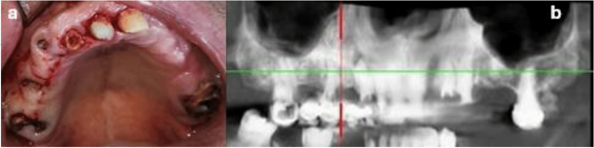 After clinical and radiographic examinations, treatment of the upper maxilla with a full-arch implant prosthesis with immediate provisional prosthesis was proposed (Figure 1a-b).