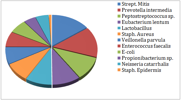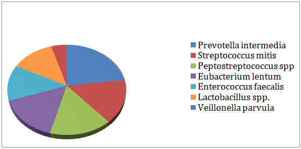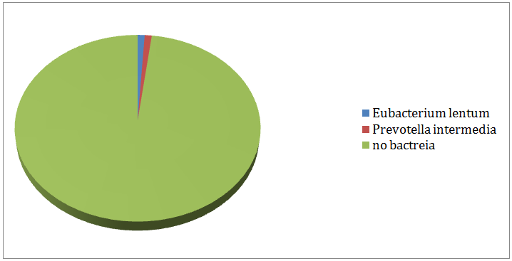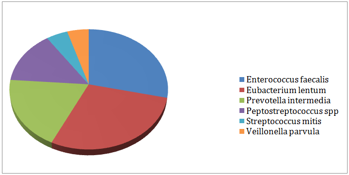 All cases revealed growth of both aerobic and anaerobic bacteria. The most common isolate bacteria (aerobes and anaerobes) and their frequency from all cases of the different groups in the 1st culture were presented in (Figure 1). Twelve types of bacteria were commonly isolated with different frequencies. Anaerobes represented about 56.1 % and aerobes represented about 43.9 % of the total bacteria. Streptococcus mitis (15.2 %) was the most frequent isolated bacteria (aerobes and anaerobes)from all the cases in the 1st culture. Then it was followed by Prevotellaintermedia (14.7%), Peptostreptococcusspp. (10.5%), Eubacteriumlentum (9.4%), Lactobacillusspp. (8.9%), Staphylococcusaureus (8.4%), Veillonellaparvula (7.9 %), Enterococcusfaecalis (7.3 %), Escherichia coli (E-coli) (6.8%), Neisseriacatarrhalis(5.2%), Proionibacterium spp. (4.7%), Staphylococcusepidermis (1%).