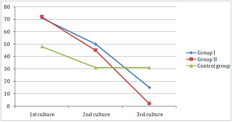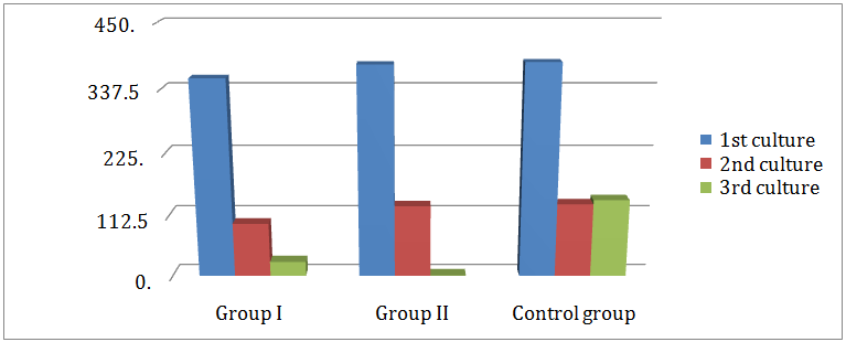 Figure 5: Comparison between numbers of bacteria isolated from 1st, 2nd and 3rd cultures in group I, group II and control group.