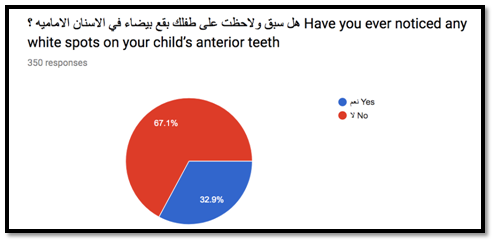 A cross-section survey written in both English and Arabic languages by researchers were distributed to the parents in Saudi Arabia by social media “twitter, Instagram, WhatsApp application” with three different forms “Yes/No question, closed questions and multiple choices questions” the total response 354 Pearson. The questionnaire consisting of 14 questions were distributed. The demographic details taken from the parents included questions to measure the awareness of the family toward their child white spot lesions and the effect on mastication function and if its effect psychologically to their child.