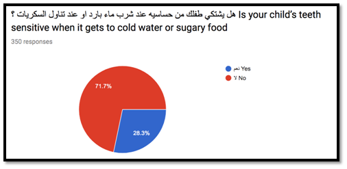 When questioned about child’s teeth sensitivity when it gets to cold water or sugary food, we found that 71.7% do not suffer while 28.3% have sensitivity problems, according to several studies a cavity makes a tooth sensitive to cold, hot, or sweets but it's often not the same type of sensitivity that adults experience.2‒7