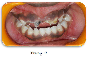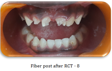 A 4 year old girl child born in Jordan and raised in Dubai, UAE reported with early childhood caries. She also had caries involving pulp in all her first primary molars. Since the child was cooperative, dental treatment was carried out in multiple appointments. Unlike the above mentioned GA case, where treatment was done in one single sitting, for this patient, in the first appointment root canal treatment of all 4 upper anterior teeth was performed.6-10 In the next appointment after 4 days, fiber post were cemented and composite restoration was done using 3M strip crowns.