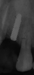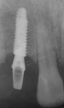 The radiological examination showed the absence of radiolarity opposite the implant, indicating good osseointegration of the implant. On the other hand, a grayish aspect at the neck was noted, showing the thinness of the vestibular cortical layer at this level.