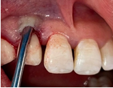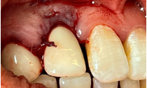 1 month after sealing , On the other hand, a grayish aspect at the neck was noted. In implantology, connective tissue grafting is indicated at all stages of implant therapy to guarantee an optimal esthetic result. Application of a connective graft in the vestibular region will reinforce the thickness of the mucosa and help recreate a vestibular convexity. When it is necessary to mask a metallization due to the underlying implant, the technique of total covering of the graft by the flap, called bilaminar flap, allows to obtain a double thickness and gives the best result.25