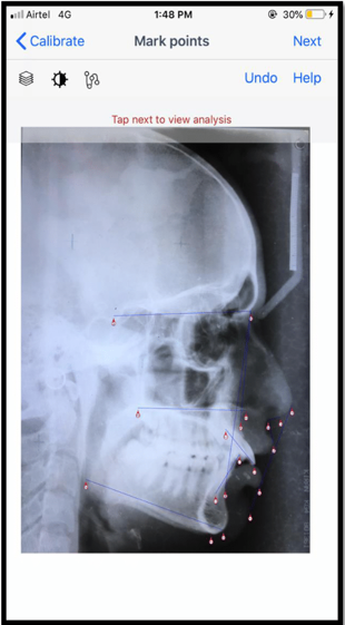 Smartphone assisted tracing was done using CephNinja version 3.66 (Cyncronus; free download from Apple App Store) on an iPhone 7 plus. (Apple Corporation, Palo Alto, CA, USA). The same cephalogram obtained from planmeca x-ray machine were placed on an x-ray viewing box and right facing photograph of the same x-ray was taken from I phone 7 plus. These photographs were then inserted in the application, cropped flipped and rotated within the application itself as per our convenience. Before tracings, the cephalograms were calibrated using the tools within the application. Landmark identification was done using touch gesture on the iPhone. Zooming in option allowed to easily hold and drag the pins to exact positions.