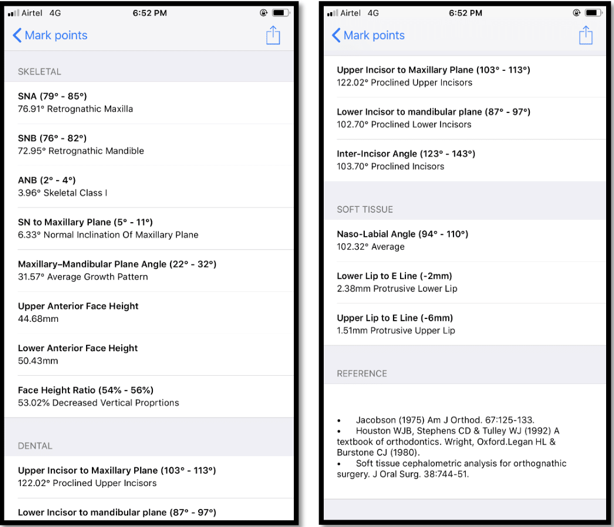 Figure 1 is a screenshot taken from the smartphone application cephNinja showing the various parameters used in the study. Figure 2 are the obtained measurements of the various parameters from the smartphone cephNinja application.