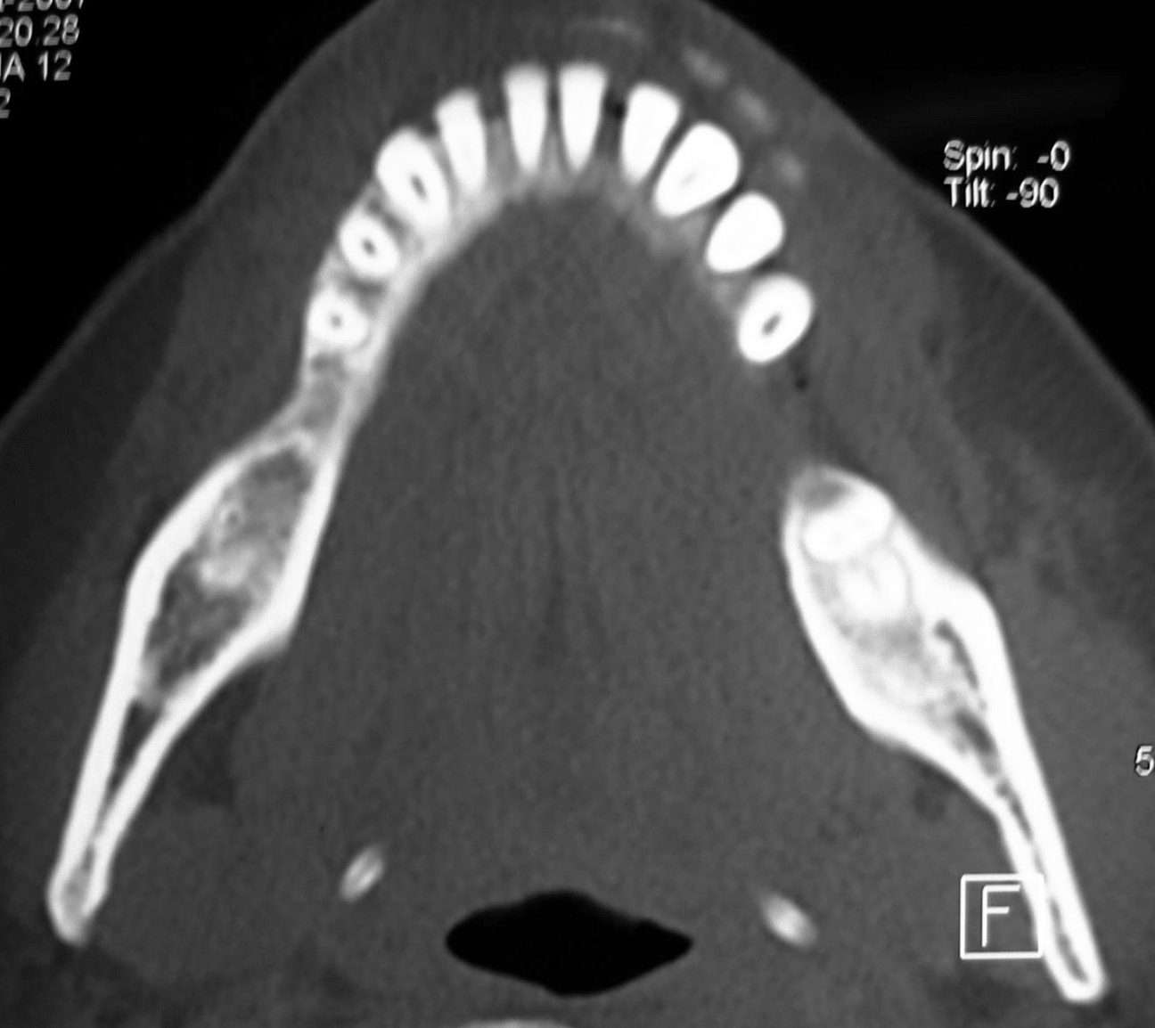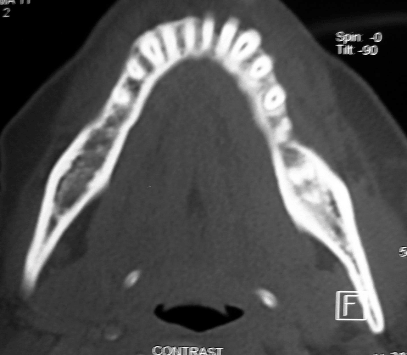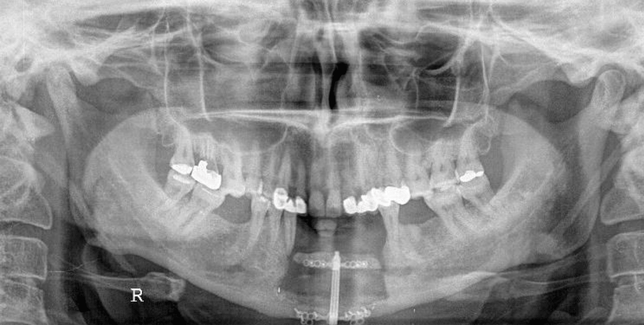 Patient: In a 50-year-old female patient marginal resection was done for treatment of gingival Squamous Cell Carcinoma and an attempt was made to reconstruct the mandible using distraction osteogenesis during contaminant chemotherapy.