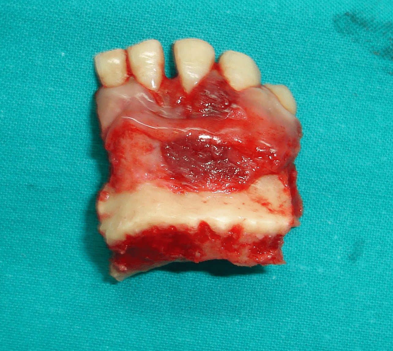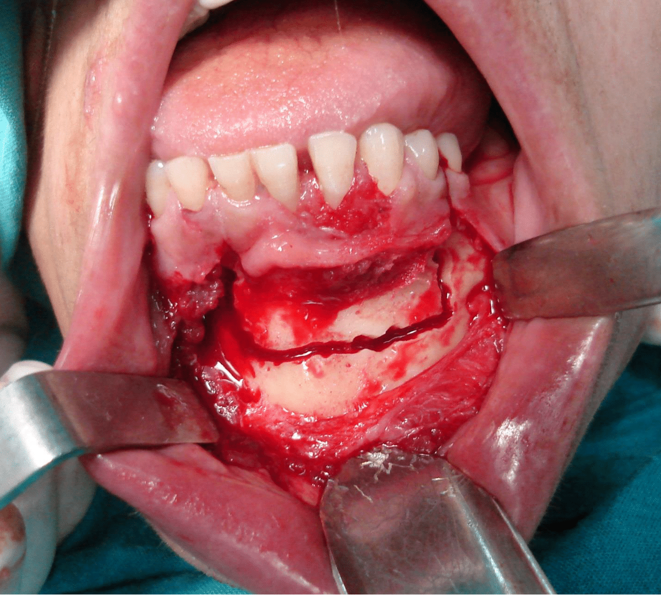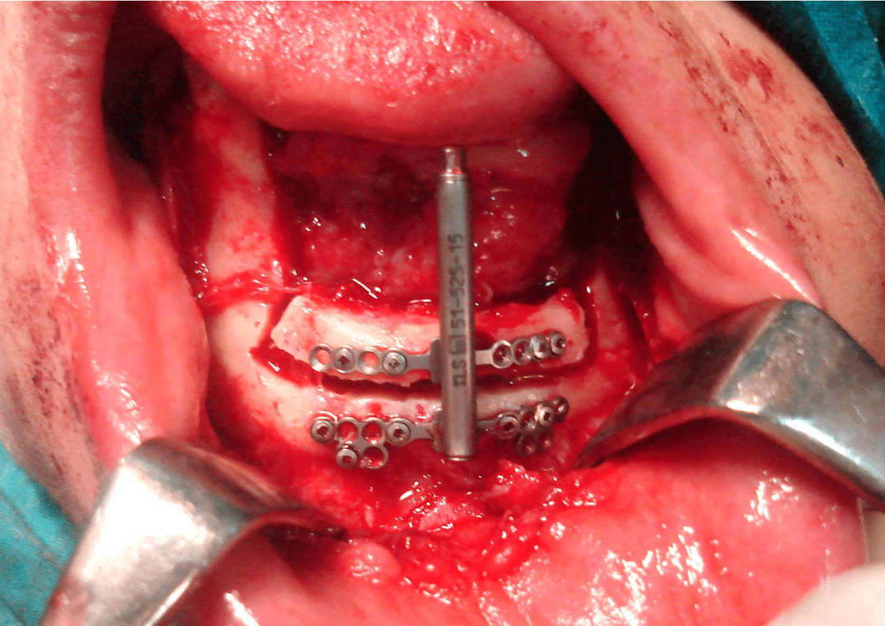 After one month, under nasoendotracheal general anesthesia. The access is obtained through the usual genioplasty incision. A Subperiosteal plane is carefully developed to expose the osteotomy site, while an intact periosteal layer is maintained. The osteotomy is placed in the predetermined position on the basis of the findings on the preoperative workup.